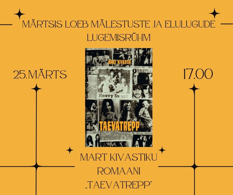 Märtsikuus ootab mälestuste ja elulugude lugemisrühma nostalgiline lugemine, sest võetakse ette 𝐌𝐚𝐫𝐭 𝐊𝐢𝐯𝐚𝐬𝐭𝐢𝐤𝐮 romaan „𝐓𝐚𝐞𝐯𝐚𝐭𝐫𝐞𝐩𝐩“.